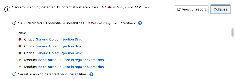 From the merge request security widget, select Expand to unfold the widget, displaying any new and no longer detected (removed) findings by scan type.