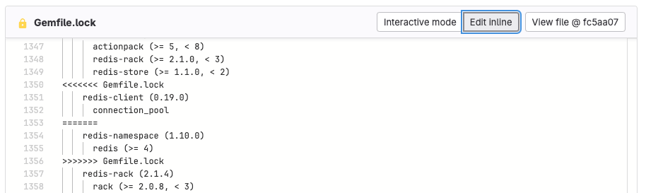 6. In the header for that file, select Edit inline to open the editor. In this example, the conflict block begins at line 1350 and ends at line 1356: